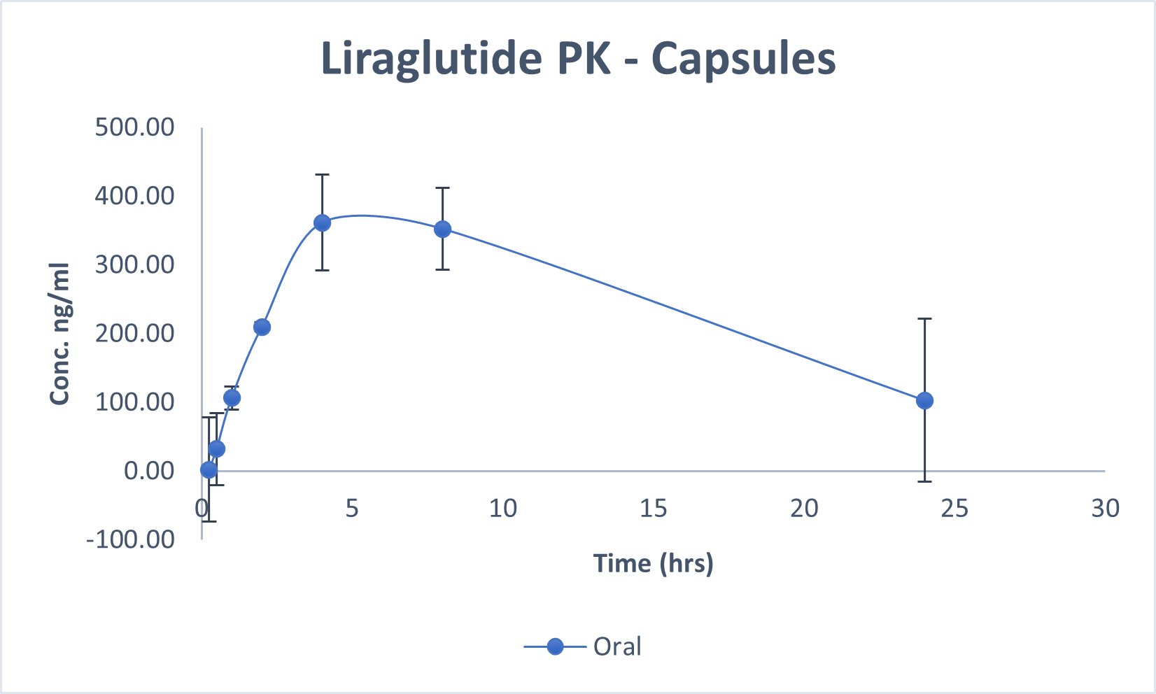 Pharmacokinetics representation of peptides administered intravenously, subcutaneously, and with BRL’s Evopep Capsule Technology in the Pig model.